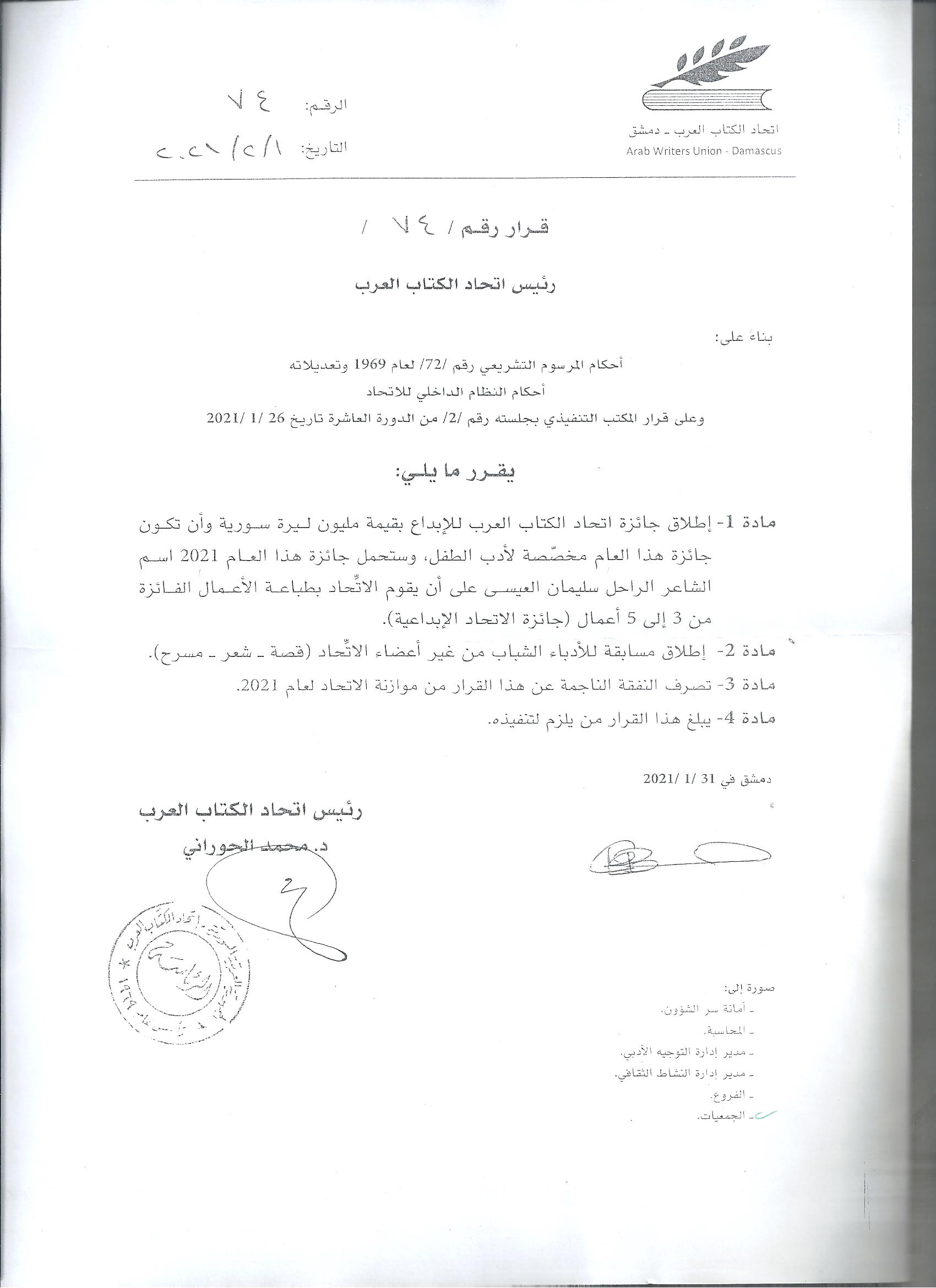 قرارات وبيانات إطلاق جائزة اتحاد الكتاب العرب للإبداع لعام 2021 آخر تحديث 2021-11-02 10:37 م تاريخ النشر 2021-02-01 شارك وقت القراءة شارك عدد القراءات : 6486 شارك هذا المقال Facebook Whatsapp Whatsapp Email Print السابق ضرورة تسديد الالتزامات الماليّة لأعضاء الاتحاد التالي إطلاق المشروع الوطني لتوثيق بطولات الجيش العربي السوري والشعب العربي السوري تابعنااعثر علينا على الوسائط الاجتماعية FacebookLikeXFollowYoutubeSubscribeTelegramFollow أخبار الاتحاد اليوم الثاني …ورشة كيف تكتب قصة أنضج 2026-04-29 إطلاق موقع حروف الثقافي وعقد الاجتماع نصف السنوي لاتحاد الكتاب العرب فاصلة قصصية … ملتقى القصة والرواية المكتب الفرعي في حمص الشعر والشباب في فرع اتحاد الكتاب العرب في حماه فنون وتقنيات السرد القصصي في ورشة “تدوين” التفاعلية الثانية اتحاد الكتاب العرب هو منظمة شعبية تضم الأدباء السوريين والعرب وتقوم بنشر أعمالهم في كتب ودوريات. تأسس الاتحاد بناءً على المرسوم التشريعي رقم (72) لعام 1969، ويقع مركزه في دمشق. .