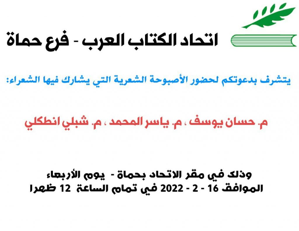 يتشرف فرع حماة لاتّحاد الكتّاب العرب بدعوتكم لحضور أصبوحة شعرية