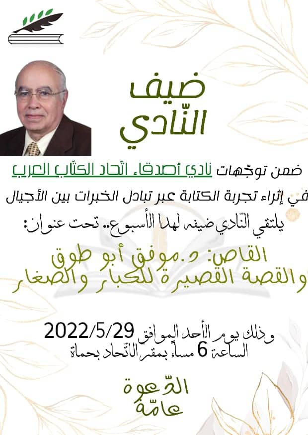 أخبار الاتحادأخبار الفروعحماة دعوة لحضور لقاء مع ضيف النادي د.موفق أبو طوق والقصة القصيرة للكبار والصغار آخر تحديث 2022-05-29 8:30 ص تاريخ النشر 2022-05-29 شارك وقت القراءة شارك شارك هذا المقال Facebook Whatsapp Whatsapp Email Print السابق دعوة لحضور محاضرة للباحث يونس ابراهيم بعنوان: دور الماسونية في إقامة الكيان الصيوني التالي معرض الكتاب لمنشورات اتحاد الكتاب العرب بدرعا تابعنااعثر علينا على الوسائط الاجتماعية FacebookLikeXFollowYoutubeSubscribeTelegramFollow أخبار الاتحاد بين اللغة والوجود.. رحلة في عمق الإنسان العربي.. 2026-04-21 في يومه العالمي… الشعر يتألق في فرع دمشق لاتحاد الكتاب العرب طرطوس | ملتقى الشعر “من ادلب الخضراء إلى طرطوس السلام” حماة – حفل توقيع كتاب “صدى الروح” للكاتبة شذى الصباغ ورشـة عمل تدريبية لتحويل القصة والرواية إلى سيناريو وحوار في فرع دمشق اتحاد الكتاب العرب هو منظمة شعبية تضم الأدباء السوريين والعرب وتقوم بنشر أعمالهم في كتب ودوريات. تأسس الاتحاد بناءً على المرسوم التشريعي رقم (72) لعام 1969، ويقع مركزه في دمشق. .