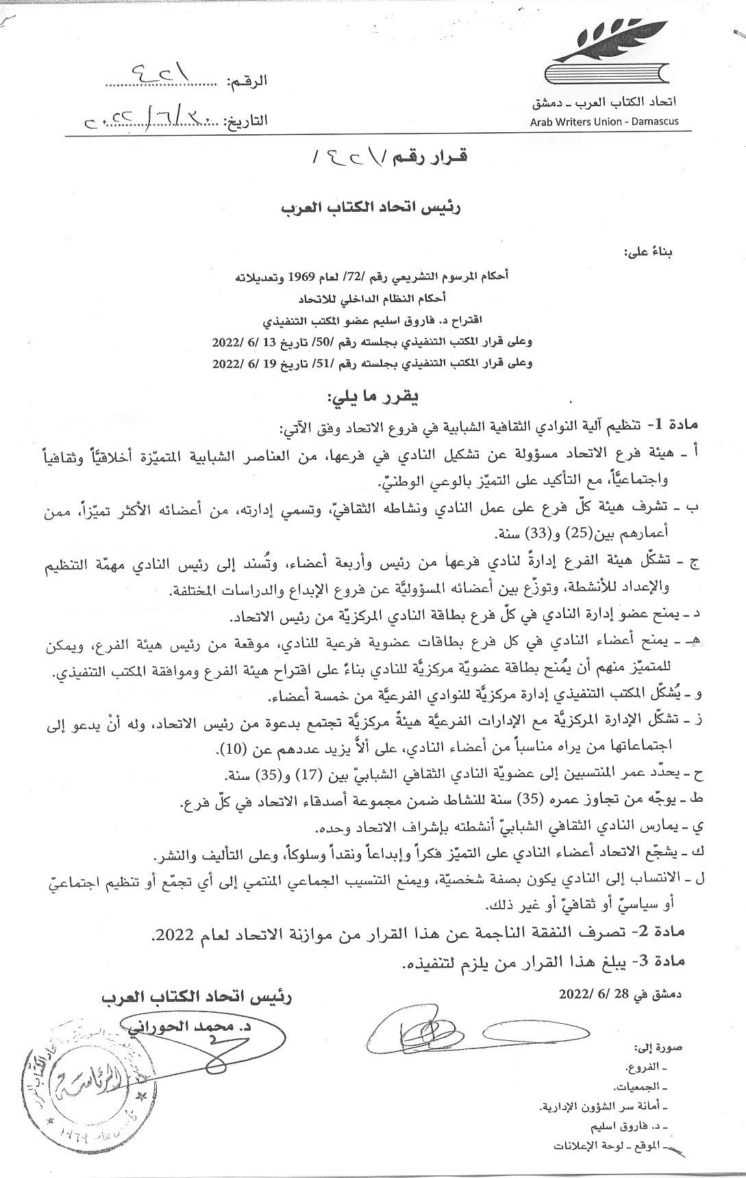 قرارات وبيانات قرار بتنظيم آلية النوادي الثقافية الشبابية آخر تحديث 2022-07-03 11:59 ص تاريخ النشر 2022-07-03 شارك وقت القراءة شارك شارك هذا المقال Facebook Whatsapp Whatsapp Email Print السابق دعوة لحضور العرض المسرحي: عالم مفعم بالجنون التالي العمل على تمكين الاتصال والتفاعل ثقافياً واجتماعياً وإعلامياً في فروع اتحاد الكتاب العرب تابعنااعثر علينا على الوسائط الاجتماعية FacebookLikeXFollowYoutubeSubscribeTelegramFollow أخبار الاتحاد ورشـة عمل تدريبية لتحويل القصة والرواية إلى سيناريو وحوار في فرع دمشق 2026-04-16 الباحث محمد جدوع.. بين “العجيلي والمسيري ، وما بينهما من رؤى “ دور المثقف واتحاد الكتاب في بناء سورية الجديدة عرض فيلم “على عتبة الطفولة” ضمن فعاليات ملتقى “أيام كردية” آفاق وتحديات التعليم العالي في سورية.. في محاضرة بطرطوس اتحاد الكتاب العرب هو منظمة شعبية تضم الأدباء السوريين والعرب وتقوم بنشر أعمالهم في كتب ودوريات. تأسس الاتحاد بناءً على المرسوم التشريعي رقم (72) لعام 1969، ويقع مركزه في دمشق. .