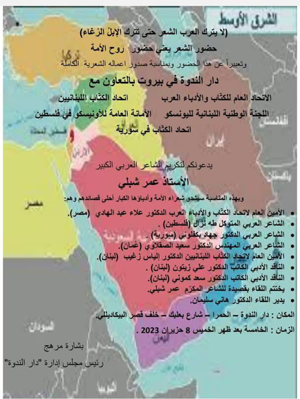 أخبار الاتحاد دعوة لحضور تكريم الشاعر العربي الكبير الأستاذ عمر شلبي آخر تحديث 2023-06-08 8:41 ص تاريخ النشر 2023-06-08 شارك وقت القراءة شارك شارك هذا المقال Facebook Whatsapp Whatsapp Email Print السابق القرار 376 للإعلان عن جائزة باسم جمعية القصة والرواية التالي هيئات تحرير جديدة لدوريات اتحاد الكتاب العرب اعتباراً من 22/5/2023 تابعنااعثر علينا على الوسائط الاجتماعية FacebookLikeXFollowYoutubeSubscribeTelegramFollow أخبار الاتحاد طرطوس | ملتقى الشعر “من ادلب الخضراء إلى طرطوس السلام” 2026-04-19 حماة – حفل توقيع كتاب “صدى الروح” للكاتبة شذى الصباغ ورشـة عمل تدريبية لتحويل القصة والرواية إلى سيناريو وحوار في فرع دمشق الباحث محمد جدوع.. بين “العجيلي والمسيري ، وما بينهما من رؤى “ دور المثقف واتحاد الكتاب في بناء سورية الجديدة اتحاد الكتاب العرب هو منظمة شعبية تضم الأدباء السوريين والعرب وتقوم بنشر أعمالهم في كتب ودوريات. تأسس الاتحاد بناءً على المرسوم التشريعي رقم (72) لعام 1969، ويقع مركزه في دمشق. .
