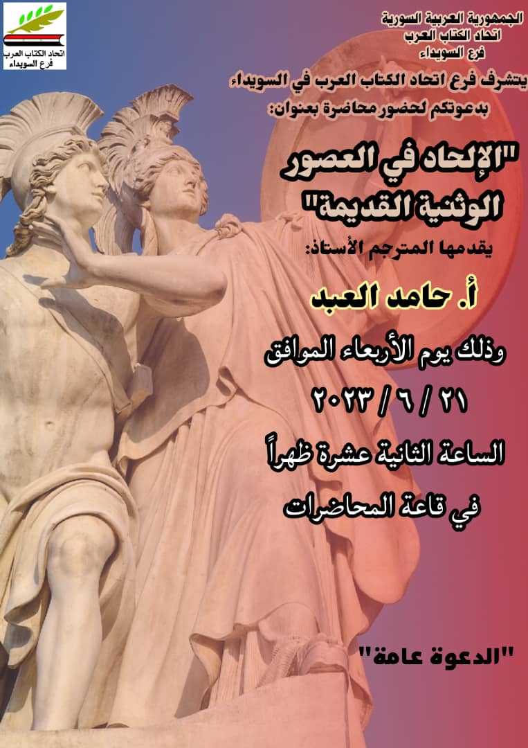 أخبار الاتحادأخبار الفروعالسويداء يتشرف فرع اتحاد الكتاب العرب في السويداء بدعوتكم لحضور محاضرة بعنوان: “الإلحاد في العصور الوثنية القديمة” آخر تحديث 2023-06-18 10:23 ص تاريخ النشر 2023-06-18 شارك وقت القراءة شارك شارك هذا المقال Facebook Whatsapp Whatsapp Email Print السابق يتشرف فرع دير الزور لاتحاد الكتاب العرب بدعوتكم إلى حضور أمسية أدبية التالي العدد (1823) 6/18 /2023م تابعنااعثر علينا على الوسائط الاجتماعية FacebookLikeXFollowYoutubeSubscribeTelegramFollow أخبار الاتحاد حفل توقيع مجموعة من كتب الباحث الإسلامي د. بسام بنيان 2026-04-01 الإعلان عن مواعيد ورشات العمل التدريبية لصقل المواهب الإبداعية في فرع القنيطرة من القراءة إلى الكتابة… لقاء ملهم لطلاب المدارس في اتحاد الكتاب العرب بدمشق ملتقى الشاعر عبدالوهاب الشيخ خليل الشعري.. فعالية ثقافية لافتة في حماة فريق تحدي القراءة في ضيافة فرع حمص اتحاد الكتاب العرب هو منظمة شعبية تضم الأدباء السوريين والعرب وتقوم بنشر أعمالهم في كتب ودوريات. تأسس الاتحاد بناءً على المرسوم التشريعي رقم (72) لعام 1969، ويقع مركزه في دمشق. .