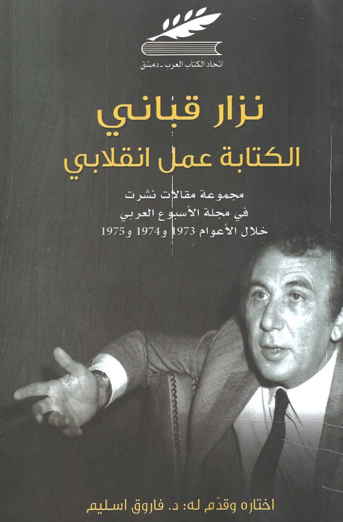 ضمن سلسلة إصدارات اتحاد الكتاب العرب بدمشق صدر كتاب حمل عنوان “الكتابة عمل انقلابي” للراحل الكبير نزار قباني اختاره وقدّم له د. فاروق اسليم.