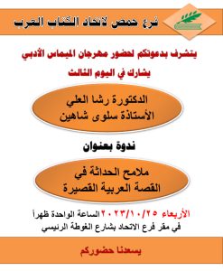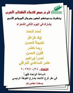 أخبار الاتحادأخبار الفروعحمص مهرجان الميماس الأدبي في فرع حمص آخر تحديث 2023-10-23 10:31 ص تاريخ النشر 2023-10-23 شارك وقت القراءة شارك شارك هذا المقال Facebook Whatsapp Whatsapp Email Print السابق فلسطين تقاوم وتنتصر التالي رغم التناقض بينهما ..«الانتماء الوطنيّ والليبراليّة الجديدة» في فرع طرطوس لاتحاد الكتّاب العرب (نقلاً عن تشرين) تابعنااعثر علينا على الوسائط الاجتماعية FacebookLikeXFollowYoutubeSubscribeTelegramFollow أخبار الاتحاد إطلاق موقع حروف الثقافي وعقد الاجتماع نصف السنوي لاتحاد الكتاب العرب 2026-04-28 فاصلة قصصية … ملتقى القصة والرواية المكتب الفرعي في حمص الشعر والشباب في فرع اتحاد الكتاب العرب في حماه فنون وتقنيات السرد القصصي في ورشة “تدوين” التفاعلية الثانية بين اللغة والوجود.. رحلة في عمق الإنسان العربي.. اتحاد الكتاب العرب هو منظمة شعبية تضم الأدباء السوريين والعرب وتقوم بنشر أعمالهم في كتب ودوريات. تأسس الاتحاد بناءً على المرسوم التشريعي رقم (72) لعام 1969، ويقع مركزه في دمشق. .