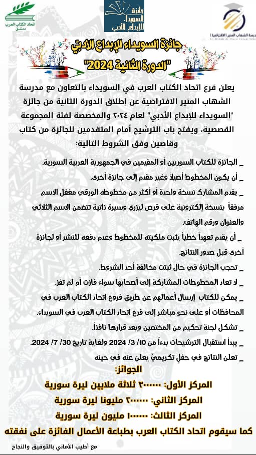 أخبار الاتحادأخبار الفروعالسويداء إطلاق الدورة الثانية من جائزة السويداء للإبداع الأدبي آخر تحديث 2024-03-25 6:49 ص تاريخ النشر 2024-03-25 شارك وقت القراءة شارك شارك هذا المقال Facebook Whatsapp Whatsapp Email Print السابق “قراءة الخطاب الشعري”… ضمن محاضرة أدبية فكرية (نقلاً عن الوحدة) التالي اتحاد الكتاب العرب فرع طرطوس يعلن عن مسابقة أدبية موضوعها: إحياء ذكرى ولادة ووفاة الشاعر نزار قباني تابعنااعثر علينا على الوسائط الاجتماعية FacebookLikeXFollowYoutubeSubscribeTelegramFollow أخبار الاتحاد إطلاق موقع حروف الثقافي وعقد الاجتماع نصف السنوي لاتحاد الكتاب العرب 2026-04-28 فاصلة قصصية … ملتقى القصة والرواية المكتب الفرعي في حمص الشعر والشباب في فرع اتحاد الكتاب العرب في حماه فنون وتقنيات السرد القصصي في ورشة “تدوين” التفاعلية الثانية بين اللغة والوجود.. رحلة في عمق الإنسان العربي.. اتحاد الكتاب العرب هو منظمة شعبية تضم الأدباء السوريين والعرب وتقوم بنشر أعمالهم في كتب ودوريات. تأسس الاتحاد بناءً على المرسوم التشريعي رقم (72) لعام 1969، ويقع مركزه في دمشق. .