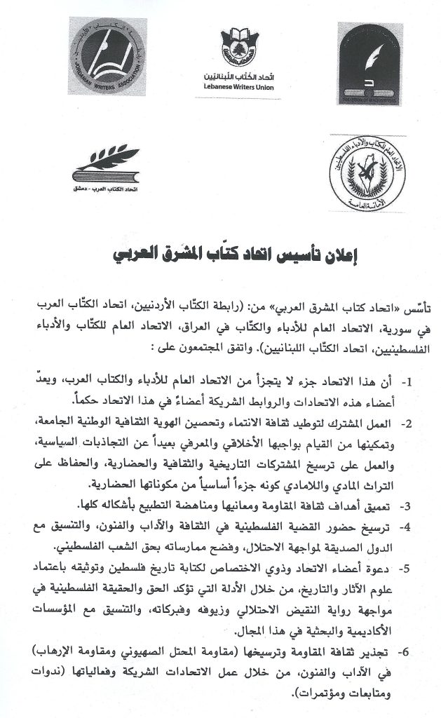 أخبار الاتحاد إعلان تأسيس اتحاد كتّاب المشرق العربي آخر تحديث 2024-04-14 2:17 م تاريخ النشر 2024-04-14 شارك وقت القراءة شارك شارك هذا المقال Facebook Whatsapp Whatsapp Email Print السابق بدء التنسيق في العمل الثقافي والأدبي بين الاتحادات في الدول المتجاورة التالي لقاء أدبي في اتحاد الكتاب العرب لتأسيس اتحاد كتاب المشرق العربي وتعزيز التعاون الثقافي في مواجهة الصهيونية (نقلاً عن سانا) تابعنااعثر علينا على الوسائط الاجتماعية FacebookLikeXFollowYoutubeSubscribeTelegramFollow أخبار الاتحاد حماة – حفل توقيع كتاب “صدى الروح” للكاتبة شذى الصباغ 2026-04-17 ورشـة عمل تدريبية لتحويل القصة والرواية إلى سيناريو وحوار في فرع دمشق الباحث محمد جدوع.. بين “العجيلي والمسيري ، وما بينهما من رؤى “ دور المثقف واتحاد الكتاب في بناء سورية الجديدة عرض فيلم “على عتبة الطفولة” ضمن فعاليات ملتقى “أيام كردية” اتحاد الكتاب العرب هو منظمة شعبية تضم الأدباء السوريين والعرب وتقوم بنشر أعمالهم في كتب ودوريات. تأسس الاتحاد بناءً على المرسوم التشريعي رقم (72) لعام 1969، ويقع مركزه في دمشق. .