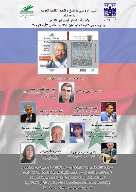 أخبار الاتحاد البيت الروسي واتحاد الكتاب العرب يدعونكم لأمسية للشاعر أيمن أبو شعر آخر تحديث 2024-11-05 9:44 ص تاريخ النشر 2024-11-05 شارك وقت القراءة شارك شارك هذا المقال Facebook Whatsapp Whatsapp Email Print السابق اللغة هوية وانتماء.. في فرع حماه التالي ندوة فكرية حول الهوية والانتماء في اتحاد ريف دمشق… تابعنااعثر علينا على الوسائط الاجتماعية FacebookLikeXFollowYoutubeSubscribeTelegramFollow أخبار الاتحاد مَكْتَبَةُ المَدْرَسَةِ لَيْسَتْ تَرَفًا 2025-11-15 الضحك بين الفلسفة والإنسان: جدلية السخرية والإصلاح أيمن ناصر وجه ثقافي سوري أصيل صديق الغربة، الرحيل الذي لا يعوّض رحيل ولكن اتحاد الكتاب العرب هو منظمة شعبية تضم الأدباء السوريين والعرب وتقوم بنشر أعمالهم في كتب ودوريات. تأسس الاتحاد بناءً على المرسوم التشريعي رقم (72) لعام 1969، ويقع مركزه في دمشق. .