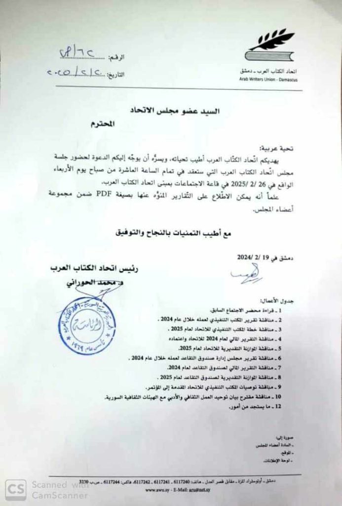 أخبار الاتحاد دعوة لحضور جلسة مجلس اتحاد الكتاب العرب آخر تحديث 2025-02-20 1:58 م تاريخ النشر 2025-02-20 شارك شارك شارك هذا المقال Facebook Whatsapp Whatsapp Email Print السابق “آفاق تجربة الشاعر محمد وليد المصري ” محاضرة في اتحاد الكتاب بحمص (نقلاً عن العروبة) التالي إلى فريد المذهان/ قيصر الكاميرا (نقلاً عن الفداء) تابعنااعثر علينا على الوسائط الاجتماعية FacebookLikeXFollowYoutubeSubscribeTelegramFollow أخبار الاتحاد وفد من كلية الآداب بجامعة طرطوس يزور فرع اتحاد الكتاب العرب 2026-03-09 طرطوس | لقاء أدبي إمكانيات التعاون بين اتحاد الكتاب العرب واتحاد العمال إعــــلان كتاب “الرواية الحديثة”… خارطة د. حسام عتال لفهم السرد الروائي اتحاد الكتاب العرب هو منظمة شعبية تضم الأدباء السوريين والعرب وتقوم بنشر أعمالهم في كتب ودوريات. تأسس الاتحاد بناءً على المرسوم التشريعي رقم (72) لعام 1969، ويقع مركزه في دمشق. .