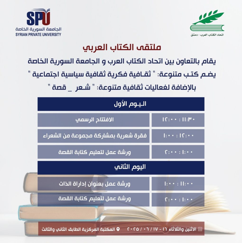 أخبار الاتحادمؤتمرات وندوات ملتقى الكتاب العربي آخر تحديث 2025-07-20 5:12 م تاريخ النشر 2025-06-10 شارك شارك شارك هذا المقال Facebook Whatsapp Whatsapp Email Print السابق وفاة الشاعر شعبان سليم التالي حوار مفتوح مع الشاعر والناقد محمد طه العثمان تابعنااعثر علينا على الوسائط الاجتماعية FacebookLikeXFollowYoutubeSubscribeTelegramFollow أخبار الاتحاد وفد من كلية الآداب بجامعة طرطوس يزور فرع اتحاد الكتاب العرب 2026-03-09 طرطوس | لقاء أدبي إمكانيات التعاون بين اتحاد الكتاب العرب واتحاد العمال إعــــلان كتاب “الرواية الحديثة”… خارطة د. حسام عتال لفهم السرد الروائي اتحاد الكتاب العرب هو منظمة شعبية تضم الأدباء السوريين والعرب وتقوم بنشر أعمالهم في كتب ودوريات. تأسس الاتحاد بناءً على المرسوم التشريعي رقم (72) لعام 1969، ويقع مركزه في دمشق. .