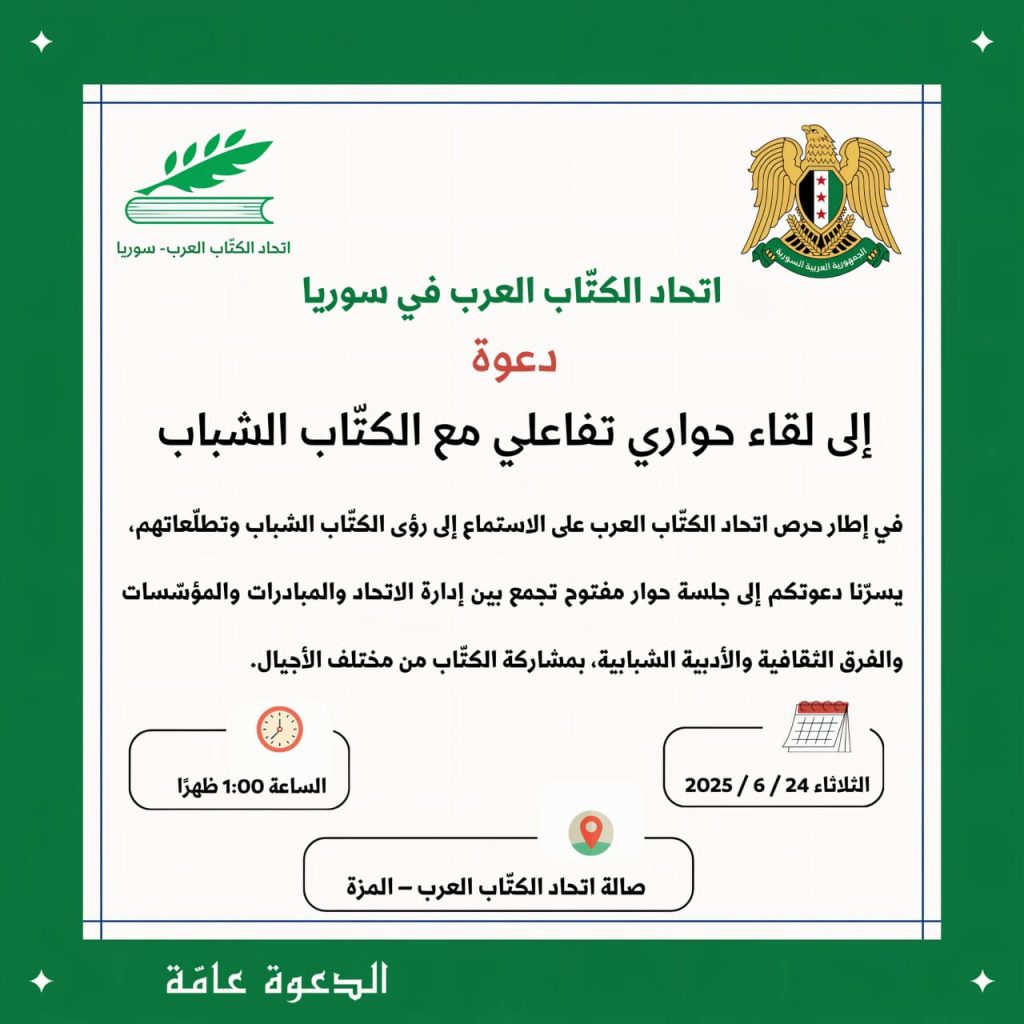 في إطار تعزيز الحوار الثقافي بين الأجيال، وحرصًا من اتحاد الكتّاب العرب على الاستماع إلى رؤى الكتّاب الشباب وتطلعاتهم.. يدعوكم الاتحاد لحضور جلسة حوار مفتوح تجمع بين إدارة الاتحاد والمبادرات والمؤسسات والفرق الثقافيّة والأدبيّة الشبابيّة، إلى جانب المهتمّين من الأدباء والكتّاب من مختلف الأجيال.