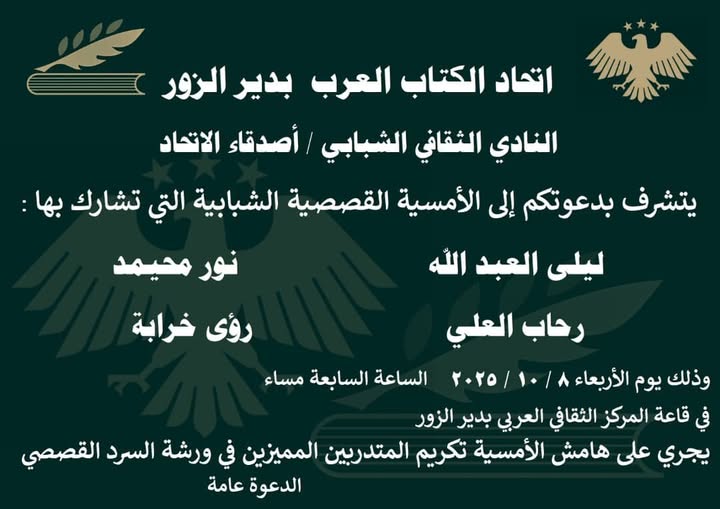 الأجندة الثقافية دير الزور │ أمسية قصصية شبابية آخر تحديث 2025-10-06 10:59 ص تاريخ النشر 2025-10-06 شارك شارك شارك هذا المقال Facebook Whatsapp Whatsapp Email Print السابق أن تكتب قبل أن تموت التالي حمص │ ندوة حول كتاب “الربيع المحاصر” تابعنااعثر علينا على الوسائط الاجتماعية FacebookLikeXFollowYoutubeSubscribeTelegramFollow أخبار الاتحاد اختتام ورشة “كتابة الحكايات” في حمص بالتعاون مع دار إيبلا 2025-10-06 قصائد ابن الفرات تناغي ضفاف العاصي الشعر يروي حكاية وطن وأم الشهيد تستذكر وجعها في دير الزور حمص │ ندوة حول كتاب “الربيع المحاصر” دير الزور │ أمسية قصصية شبابية اتحاد الكتاب العرب هو منظمة شعبية تضم الأدباء السوريين والعرب وتقوم بنشر أعمالهم في كتب ودوريات. تأسس الاتحاد بناءً على المرسوم التشريعي رقم (72) لعام 1969، ويقع مركزه في دمشق. .