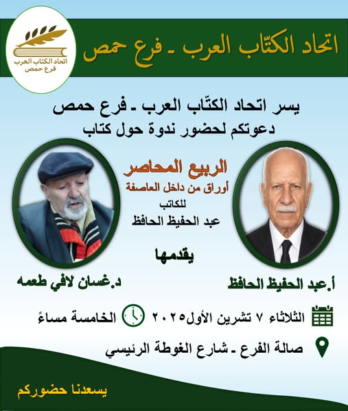 الأجندة الثقافية حمص │ ندوة حول كتاب “الربيع المحاصر” آخر تحديث 2025-10-06 11:17 ص تاريخ النشر 2025-10-06 شارك شارك شارك هذا المقال Facebook Whatsapp Whatsapp Email Print السابق دير الزور │ أمسية قصصية شبابية التالي الشعر يروي حكاية وطن وأم الشهيد تستذكر وجعها في دير الزور تابعنااعثر علينا على الوسائط الاجتماعية FacebookLikeXFollowYoutubeSubscribeTelegramFollow أخبار الاتحاد اختتام ورشة “كتابة الحكايات” في حمص بالتعاون مع دار إيبلا 2025-10-06 قصائد ابن الفرات تناغي ضفاف العاصي الشعر يروي حكاية وطن وأم الشهيد تستذكر وجعها في دير الزور حمص │ ندوة حول كتاب “الربيع المحاصر” دير الزور │ أمسية قصصية شبابية اتحاد الكتاب العرب هو منظمة شعبية تضم الأدباء السوريين والعرب وتقوم بنشر أعمالهم في كتب ودوريات. تأسس الاتحاد بناءً على المرسوم التشريعي رقم (72) لعام 1969، ويقع مركزه في دمشق. .