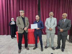 قُدّم في ختام الفعالية درع تكريمي لأسرة الراحل تميم صائب، ممثلة بالأستاذ تليد صائب، تقديراً لدعمهم وتمويلهم للمسابقة.