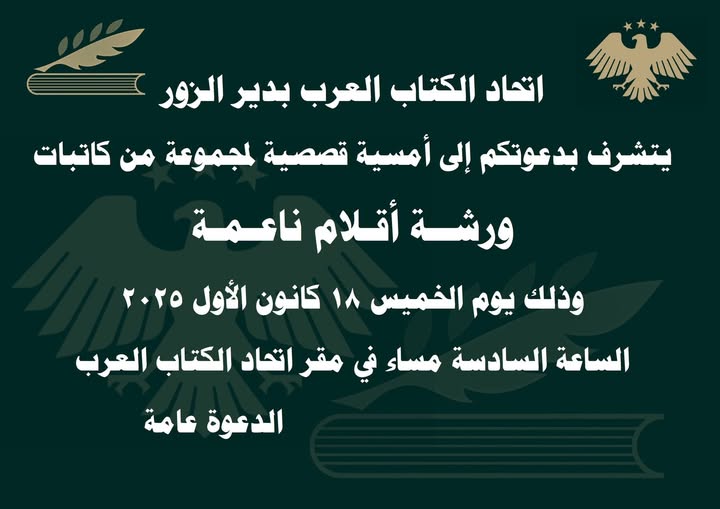 الأجندة الثقافية دير الزور │ أمسية قصصية لمجموعة من كاتبات “أقلام ناعمة” آخر تحديث 2025-12-17 11:30 ص تاريخ النشر 2025-12-17 شارك شارك شارك هذا المقال Facebook Whatsapp Whatsapp Email Print السابق بالكلمة الحرة وقصائد الانتصار إدلب تحتفي بذكرى التحرير التالي دير الزور │ ندوة “اللغة العربية ما بعد الثورة.. الواقع والتحديات” تابعنااعثر علينا على الوسائط الاجتماعية FacebookLikeXFollowYoutubeSubscribeTelegramFollow أخبار الاتحاد الآداب العالميـة العدد المزدوج 202 – 203 ربيع وصيف 2025 2025-12-18 “أثر التكنولوجيا في بناء الثقافة والإنسان” في محاضرة بطرطوس حديث عن المخيمات… مع الأديبة ابتسام شاكوش في اللاذقية أمسية شعرية احتفاءً بذكرى التحرير في تلبيسة دير الزور │ ندوة “اللغة العربية ما بعد الثورة.. الواقع والتحديات” اتحاد الكتاب العرب هو منظمة شعبية تضم الأدباء السوريين والعرب وتقوم بنشر أعمالهم في كتب ودوريات. تأسس الاتحاد بناءً على المرسوم التشريعي رقم (72) لعام 1969، ويقع مركزه في دمشق. .