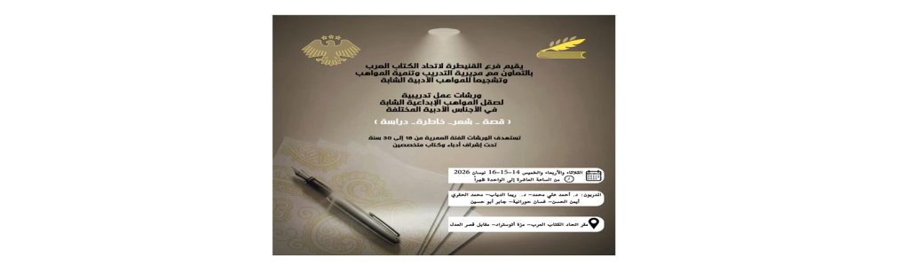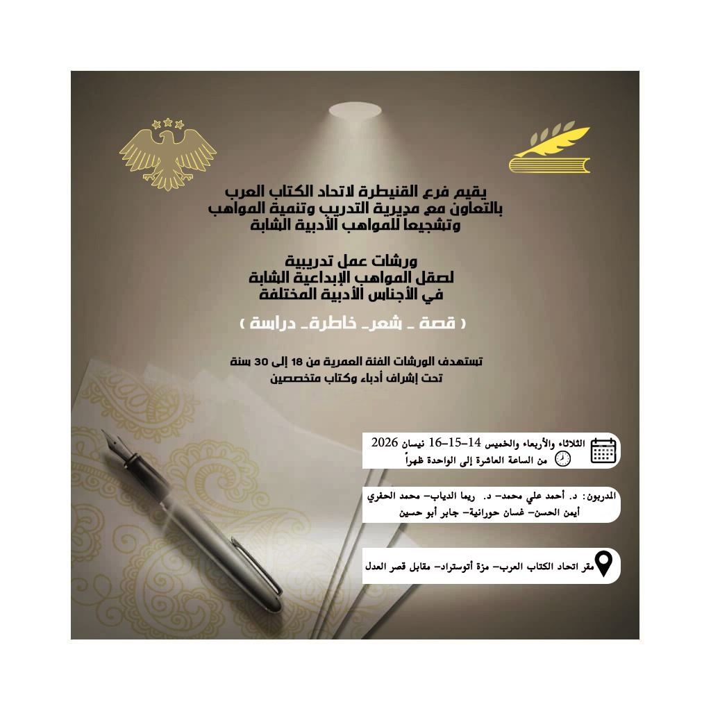 أخبار الاتحادأخبار الفروعالقنيطرةرئيسي الإعلان عن مواعيد ورشات العمل التدريبية لصقل المواهب الإبداعية في فرع القنيطرة آخر تحديث 2026-04-01 12:13 م تاريخ النشر 2026-04-01 شارك وقت القراءة شارك شارك هذا المقال Facebook Whatsapp Whatsapp Email Print السابق من القراءة إلى الكتابة… لقاء ملهم لطلاب المدارس في اتحاد الكتاب العرب بدمشق التالي حفل توقيع مجموعة من كتب الباحث الإسلامي د. بسام بنيان تابعنااعثر علينا على الوسائط الاجتماعية FacebookLikeXFollowYoutubeSubscribeTelegramFollow أخبار الاتحاد حفل توقيع مجموعة من كتب الباحث الإسلامي د. بسام بنيان 2026-04-01 الإعلان عن مواعيد ورشات العمل التدريبية لصقل المواهب الإبداعية في فرع القنيطرة من القراءة إلى الكتابة… لقاء ملهم لطلاب المدارس في اتحاد الكتاب العرب بدمشق ملتقى الشاعر عبدالوهاب الشيخ خليل الشعري.. فعالية ثقافية لافتة في حماة فريق تحدي القراءة في ضيافة فرع حمص اتحاد الكتاب العرب هو منظمة شعبية تضم الأدباء السوريين والعرب وتقوم بنشر أعمالهم في كتب ودوريات. تأسس الاتحاد بناءً على المرسوم التشريعي رقم (72) لعام 1969، ويقع مركزه في دمشق. .