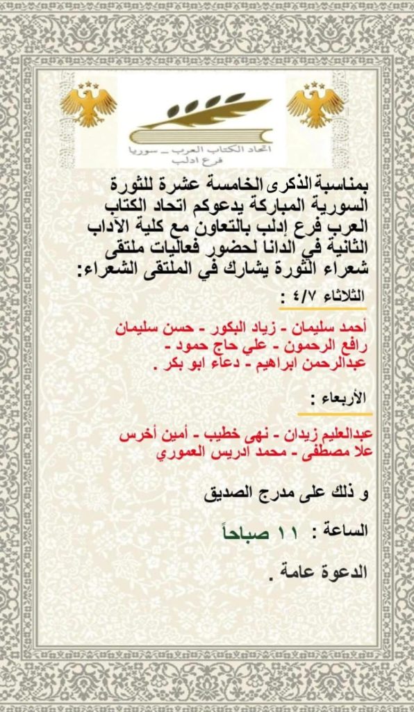 الأجندة الثقافية ادلب | ملتقى شعراء الثورة آخر تحديث 2026-04-06 11:24 ص تاريخ النشر 2026-04-06 شارك وقت القراءة شارك شارك هذا المقال Facebook Whatsapp Whatsapp Email Print السابق اتحاد الكتاب العرب يفتتح أولى ورشات “تدوين” التدريبية التالي طرطوس | محاضرة ثنائية الحياة (الجندر) تابعنااعثر علينا على الوسائط الاجتماعية FacebookLikeXFollowYoutubeSubscribeTelegramFollow أخبار الاتحاد المرأة في الحياة … لوحة فكرية في محاضرة ثقافية بطرطوس 2026-04-08 2026-04-08 ملتقى شعراء الثورة الأول في ادلب…توثيق للعبور إلى ساحات الحرية ورشة الحضور الإعلامي للمثقف… تعزيز فن المواجهة الواثقة اتحاد الكتاب العرب يعيد فتح مقراته القديمة في كل من إدلب والرقة ودير الزور والحسكة اتحاد الكتاب العرب هو منظمة شعبية تضم الأدباء السوريين والعرب وتقوم بنشر أعمالهم في كتب ودوريات. تأسس الاتحاد بناءً على المرسوم التشريعي رقم (72) لعام 1969، ويقع مركزه في دمشق. .