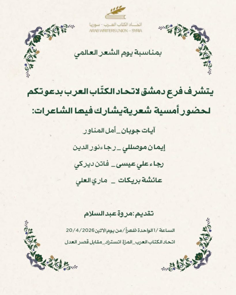 الأجندة الثقافية دمشق | أمسية شعرية بمناسبة يوم الشعر العالمي آخر تحديث 2026-04-08 12:35 م تاريخ النشر 2026-04-08 شارك وقت القراءة شارك شارك هذا المقال Facebook Whatsapp Whatsapp Email Print السابق تابعنااعثر علينا على الوسائط الاجتماعية FacebookLikeXFollowYoutubeSubscribeTelegramFollow أخبار الاتحاد دمشق | أمسية شعرية بمناسبة يوم الشعر العالمي 2026-04-08 2026-04-08 المرأة في الحياة … لوحة فكرية في محاضرة ثقافية بطرطوس 2026-04-08 ملتقى شعراء الثورة الأول في ادلب…توثيق للعبور إلى ساحات الحرية اتحاد الكتاب العرب هو منظمة شعبية تضم الأدباء السوريين والعرب وتقوم بنشر أعمالهم في كتب ودوريات. تأسس الاتحاد بناءً على المرسوم التشريعي رقم (72) لعام 1969، ويقع مركزه في دمشق. .