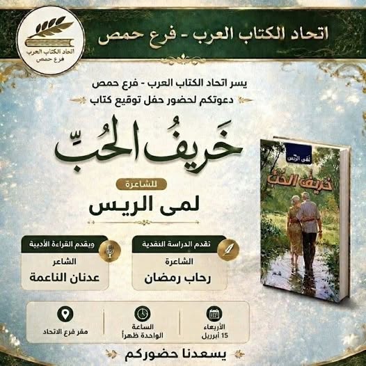الأجندة الثقافية حمص | حفل توقيع كتاب “خريف الحب” للمى الريّس آخر تحديث 2026-04-14 10:28 ص تاريخ النشر 2026-04-14 شارك وقت القراءة شارك شارك هذا المقال Facebook Whatsapp Whatsapp Email Print السابق همسات القصيدة… في رحاب حمص تابعنااعثر علينا على الوسائط الاجتماعية FacebookLikeXFollowYoutubeSubscribeTelegramFollow أخبار الاتحاد حمص | حفل توقيع كتاب “خريف الحب” للمى الريّس 2026-04-14 همسات القصيدة… في رحاب حمص ملتقى “أيام كردية” في اتحاد الكتاب العرب.. تعزيز لجسور الألفة والتناغم حفل توقيع كتاب “النهر الثاني”في الحسكة لأول مرة في اتحاد الكتاب العرب… ملتقى أيام كردية اتحاد الكتاب العرب هو منظمة شعبية تضم الأدباء السوريين والعرب وتقوم بنشر أعمالهم في كتب ودوريات. تأسس الاتحاد بناءً على المرسوم التشريعي رقم (72) لعام 1969، ويقع مركزه في دمشق. .