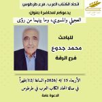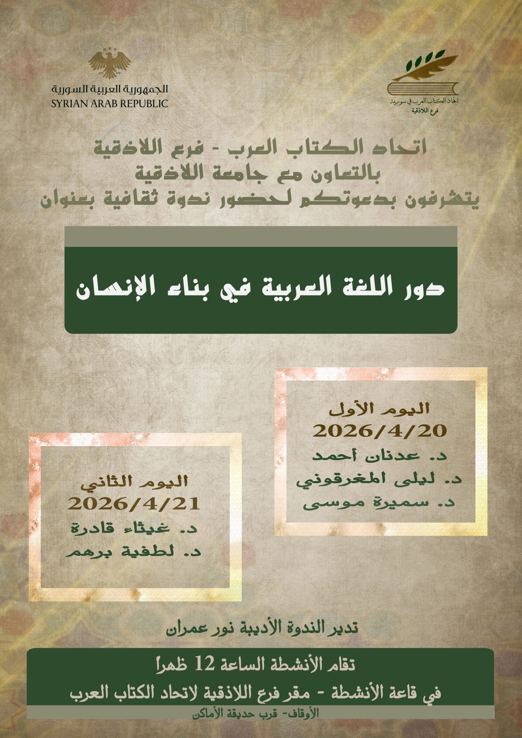 الأجندة الثقافية اللاذقية | ندوة “دور اللغة العربية في بناء الإنسان” آخر تحديث 2026-04-15 10:38 ص تاريخ النشر 2026-04-15 شارك وقت القراءة شارك شارك هذا المقال Facebook Whatsapp Whatsapp Email Print السابق حمص | حفل توقيع كتاب “خريف الحب” للمى الريّس التالي طرطوس | محاضرة “العجيلي والمسيري وما بينهما من رؤى” تابعنااعثر علينا على الوسائط الاجتماعية FacebookLikeXFollowYoutubeSubscribeTelegramFollow أخبار الاتحاد ورشـة عمل تدريبية لتحويل القصة والرواية إلى سيناريو وحوار في فرع دمشق 2026-04-16 الباحث محمد جدوع.. بين “العجيلي والمسيري ، وما بينهما من رؤى “ دور المثقف واتحاد الكتاب في بناء سورية الجديدة عرض فيلم “على عتبة الطفولة” ضمن فعاليات ملتقى “أيام كردية” آفاق وتحديات التعليم العالي في سورية.. في محاضرة بطرطوس اتحاد الكتاب العرب هو منظمة شعبية تضم الأدباء السوريين والعرب وتقوم بنشر أعمالهم في كتب ودوريات. تأسس الاتحاد بناءً على المرسوم التشريعي رقم (72) لعام 1969، ويقع مركزه في دمشق. .