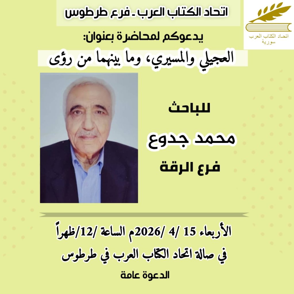 الأجندة الثقافية طرطوس | محاضرة “العجيلي والمسيري وما بينهما من رؤى” آخر تحديث 2026-04-15 10:00 ص تاريخ النشر 2026-04-15 شارك وقت القراءة شارك شارك هذا المقال Facebook Whatsapp Whatsapp Email Print السابق اللاذقية | ندوة “دور اللغة العربية في بناء الإنسان” التالي فرع القنيطرة لاتحاد الكتاب العرب يعلن عن ورشة تدريبية تحت عنوان “الأدب الرقمي وانعكاسات الذكاء الاصطناعي على الإبداع الثقافي والفكري” تابعنااعثر علينا على الوسائط الاجتماعية FacebookLikeXFollowYoutubeSubscribeTelegramFollow أخبار الاتحاد حماة – حفل توقيع كتاب “صدى الروح” للكاتبة شذى الصباغ 2026-04-17 ورشـة عمل تدريبية لتحويل القصة والرواية إلى سيناريو وحوار في فرع دمشق الباحث محمد جدوع.. بين “العجيلي والمسيري ، وما بينهما من رؤى “ دور المثقف واتحاد الكتاب في بناء سورية الجديدة عرض فيلم “على عتبة الطفولة” ضمن فعاليات ملتقى “أيام كردية” اتحاد الكتاب العرب هو منظمة شعبية تضم الأدباء السوريين والعرب وتقوم بنشر أعمالهم في كتب ودوريات. تأسس الاتحاد بناءً على المرسوم التشريعي رقم (72) لعام 1969، ويقع مركزه في دمشق. .